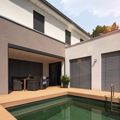 WAREMA Neubau-Aufsetz-Außenjalousien werden gemeinsam mit dem Fenster eingebaut. Dabei integrieren sie sich unauffällig in die Fassade und lassen sich hervorragend mit WAREMA Neubau-Aufsetz-Rollläden kombinieren. Ein optimierter Kastenaufbau reduziert den Lärmpegel von Draußen und verbessert die Schallschutzwerte deutlich. Damit gehören die, zusammen mit dem Fenster zu montierenden Systeme, zu den leisesten am Markt.